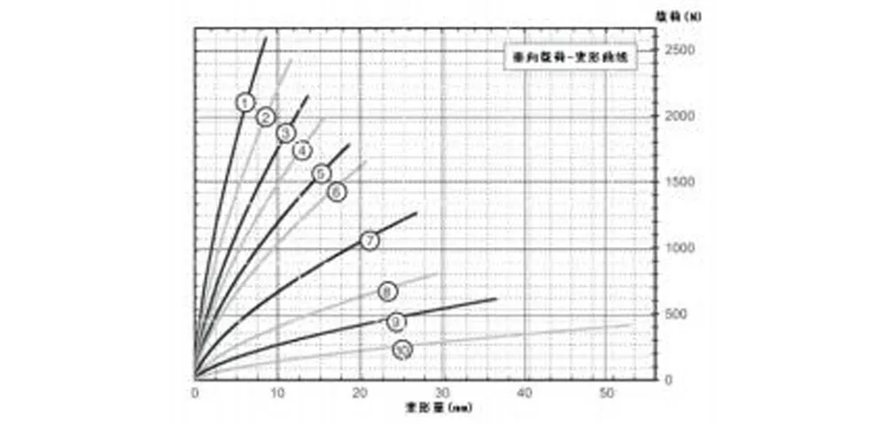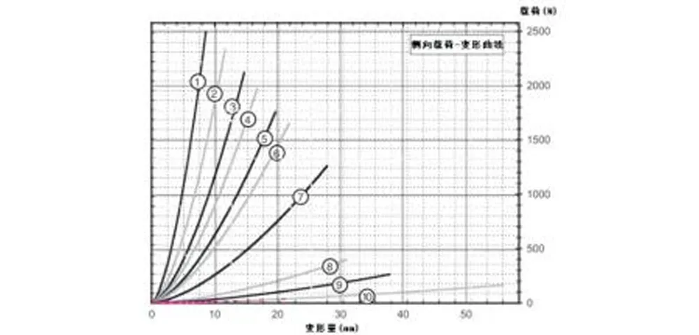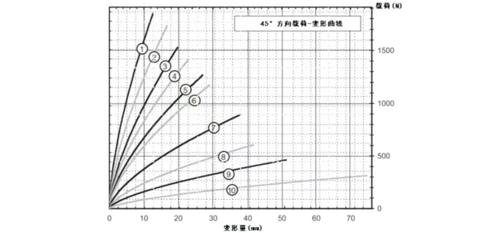 | Кривая № | Модель | Макс. статическая нагрузка (кг) | Макс. деформация (мм) | Жёсткость при вибрации (кН/м) | Жёсткость при ударе (кН/м) |