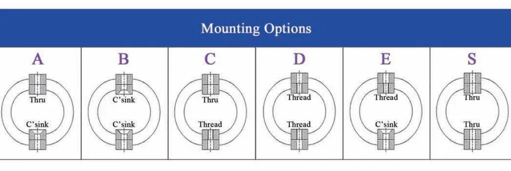 | Модель | Высота “H”±2.54 | Ширина “W” | Вес (кг) | Способ монтажа | Размер сквозного отверстия (мм) | Резьба (мм) | Угол конусной зенковки (°) |