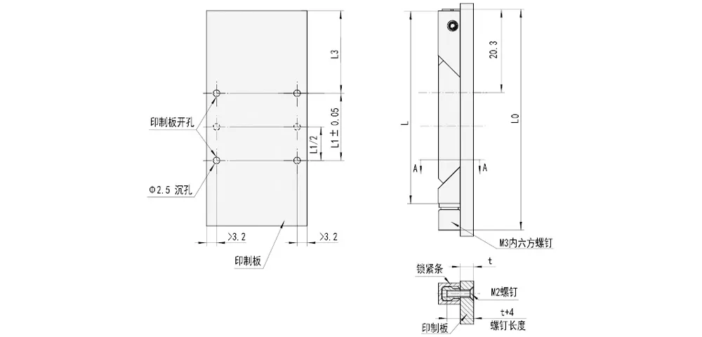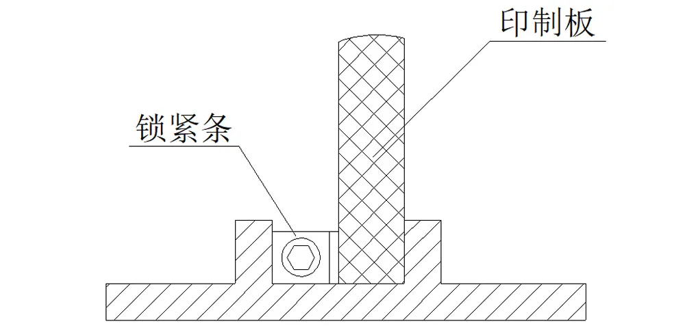 Шасси или стойка должны иметь направляющий фиксирующий паз для печатных плат и других компонентов, оснащаемых данным прижимом. Способ их фиксации в пазу показан ниже. Ширина паза (±0.2 мм) должна соответствовать толщине печатной платы и т.п. (включая теплопроводящую шину и усилительную пластину) t плюс рабочая высота устройства.